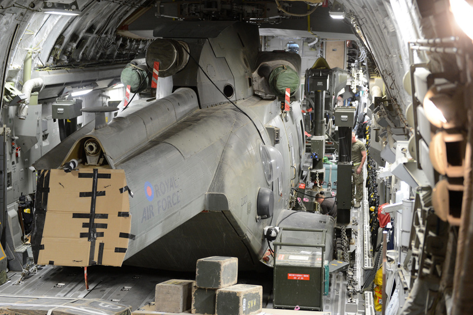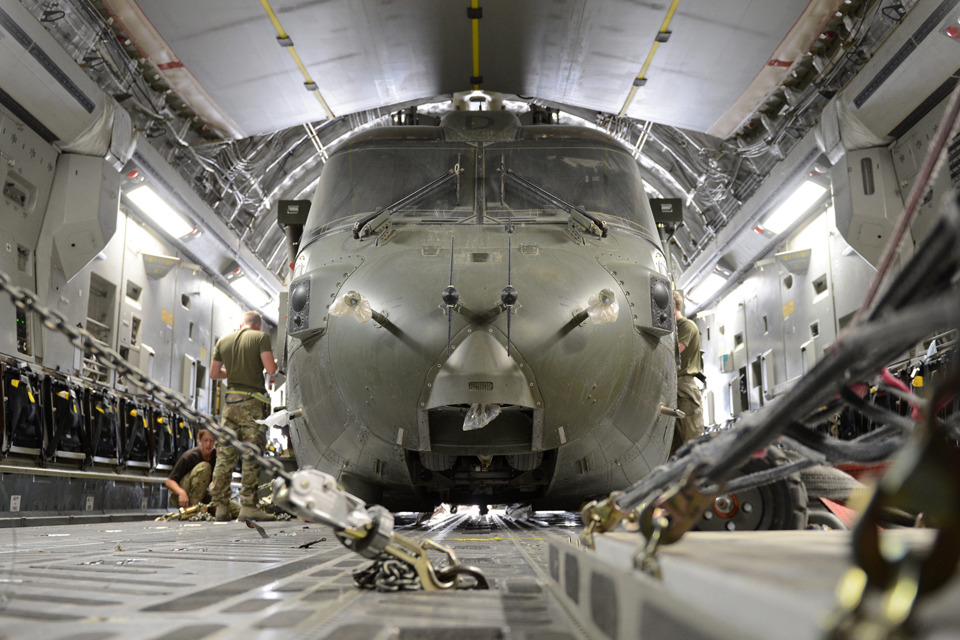 A Merlin helicopter is packed and secured into an RAF C-17 Globemaster transport aircraft [Picture: Sergeant Barry Pope, Crown copyright]