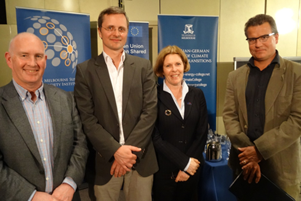 Climate Day speakers: (L-R) Professor John Wiseman, Associate Professor Malte Meinshausen, Marian Schoen of University of Melbourne’s European Union Centre on Shared Complex Challenges, Dr Bertrand Timbal.