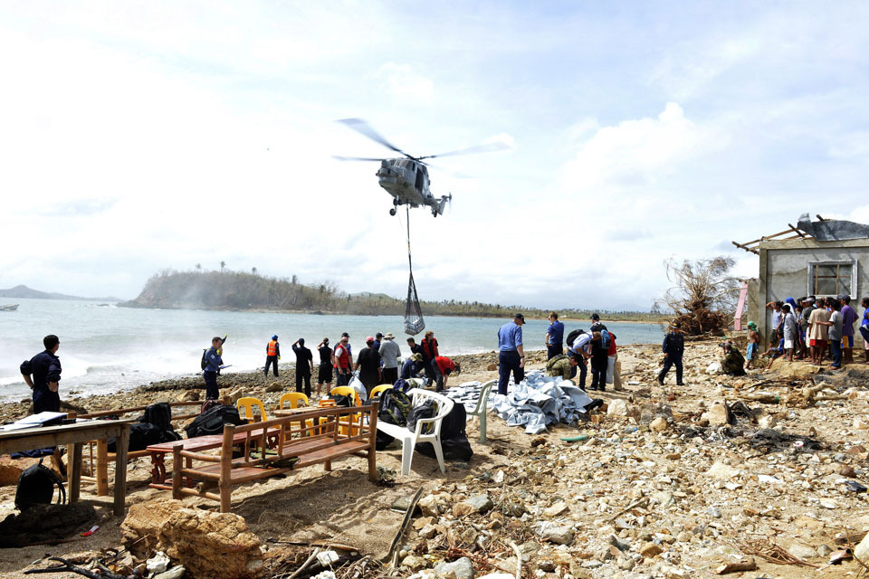 HMS Daring's Lynx helicopter delivers humanitarian relief supplies to Binuluanguan in the Philippines [Picture: Petty Officer Airman (Photographer) Paul A'Barrow, Crown copyright]