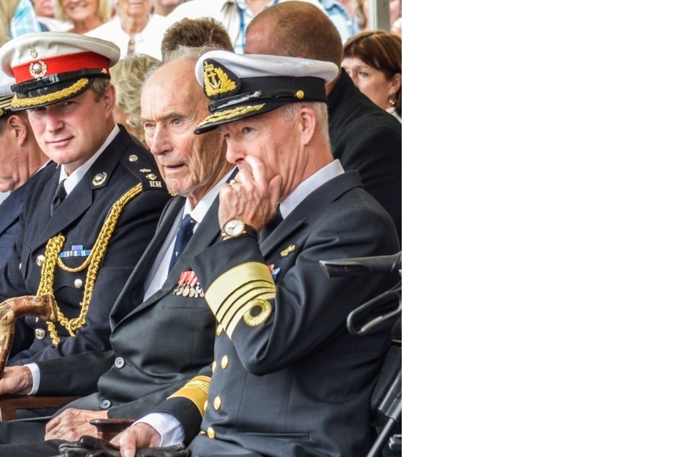 Left to right: British Defence Attaché Lt Col Matt Skuse RM, Joachim Rønneberg DSO, Norwegian Chief of Defence (CHOD) Admiral Haakon Bruun-Hanssen. Photo: Frode Berg / NRK. Not to be used without permission.