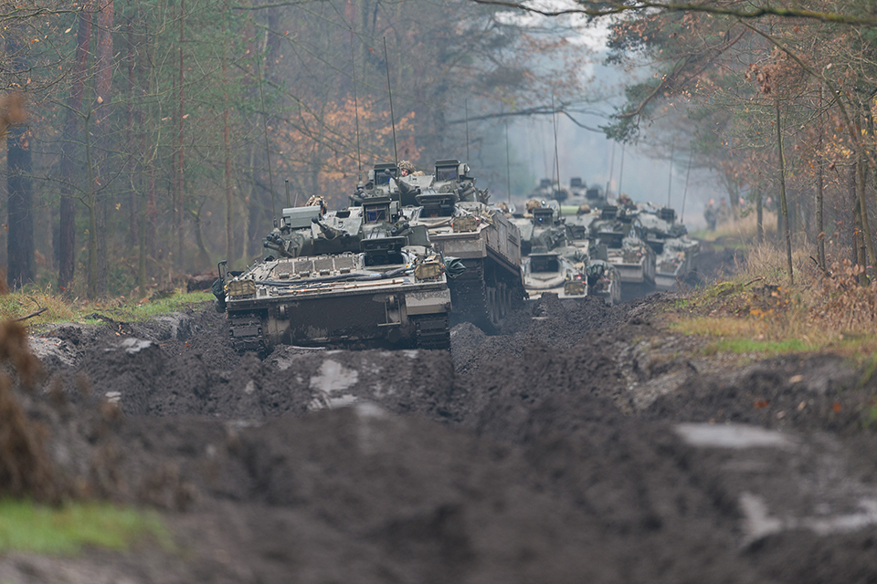 A column of Warrior Armoured fighting vehicles move through an autumnal forest track in Poland [Picture: Staff Sergeant Mark Nesbit RLC Crown copyright]