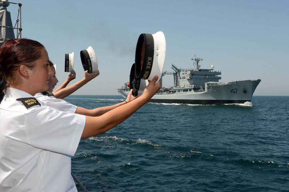 Members of HMS Northumberland's ship's company salute the Pakistan Navy auxiliary vessel PNS Nasr [Picture: Leading Airman (Photographer) Maxine Davies, Crown copyright]