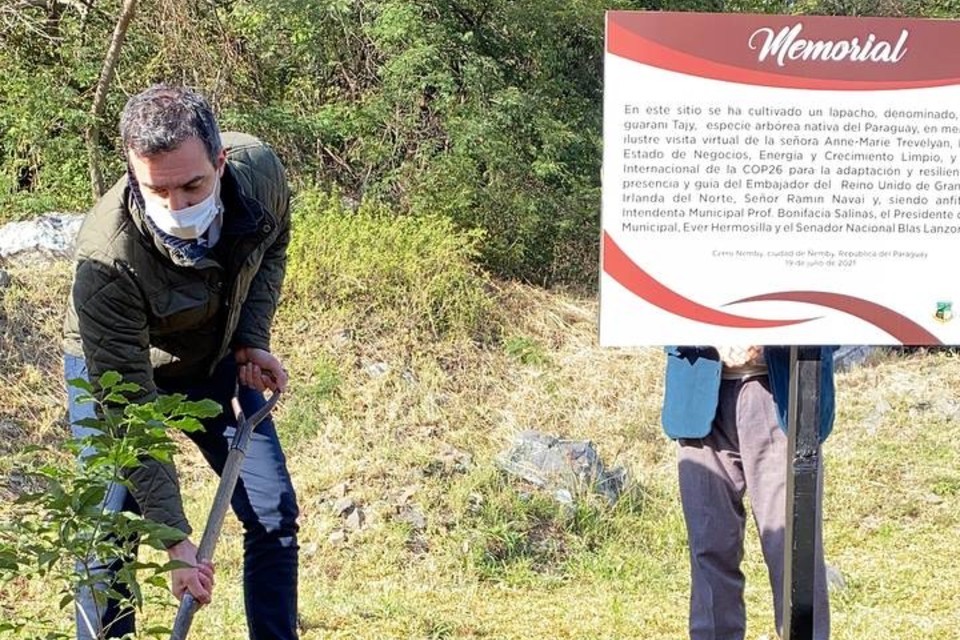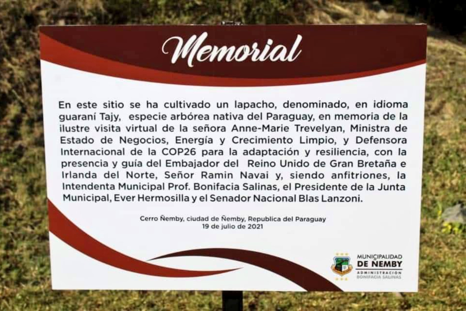 Thanks to technology, and a bit of help on the ground, the visit began by planting a Tajy native tree at the Cerro Ñemby Park from 10,000km away. During the first day, Minister Trevelyan met with the Paraguay Chapter of the UN Global Compact, formed of businesses committed to tackling climate change through active participation in COP26 campaigns such as the Race to Zero.