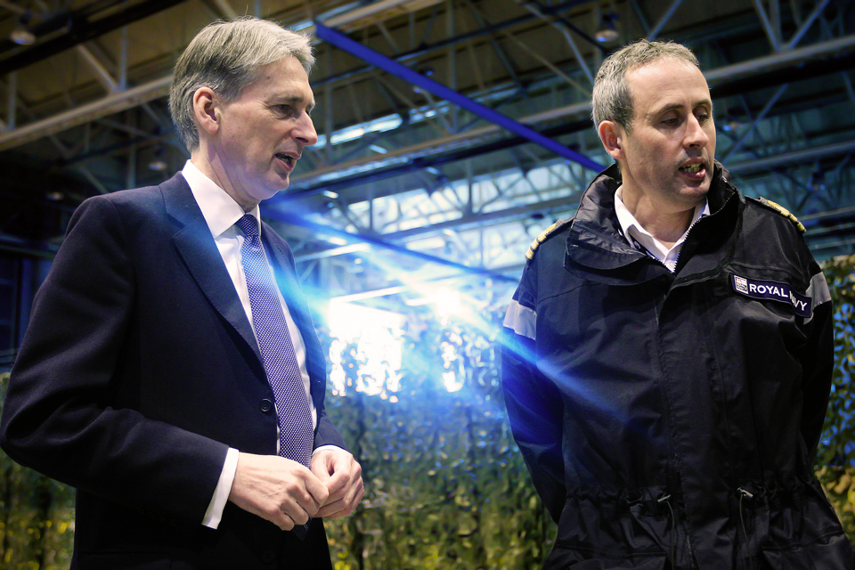 Defence Secretary Philip Hammond speaks with Royal Navy Commander Bow Wheaton at RAF Waddington [Picture: Senior Aircraftman Blake Carruthers, Crown copyright]