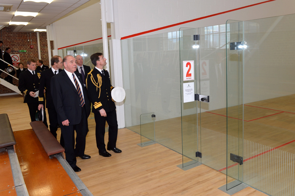 Rear Admiral Matt Parr views the new squash courts at HMS Temeraire [Picture: Leading Airman (Photographer) Jay Allen, Crown copyright]