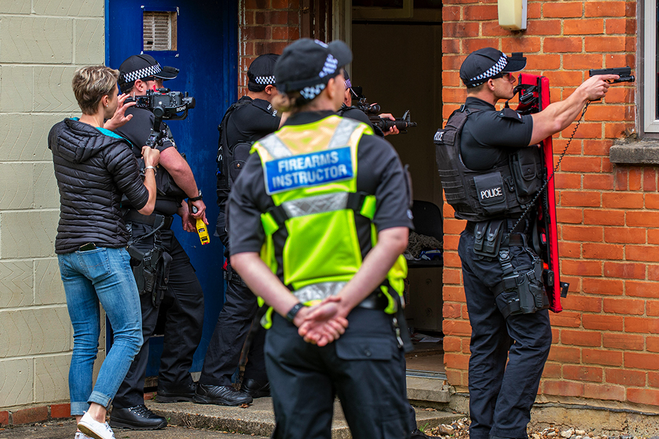 Videographer, Firearms Instructors and officers outside a building, with firearms drawn. British Forces Broadcasting Service filming Ministry of Defence Police firearms training scenario. Crown copyright.