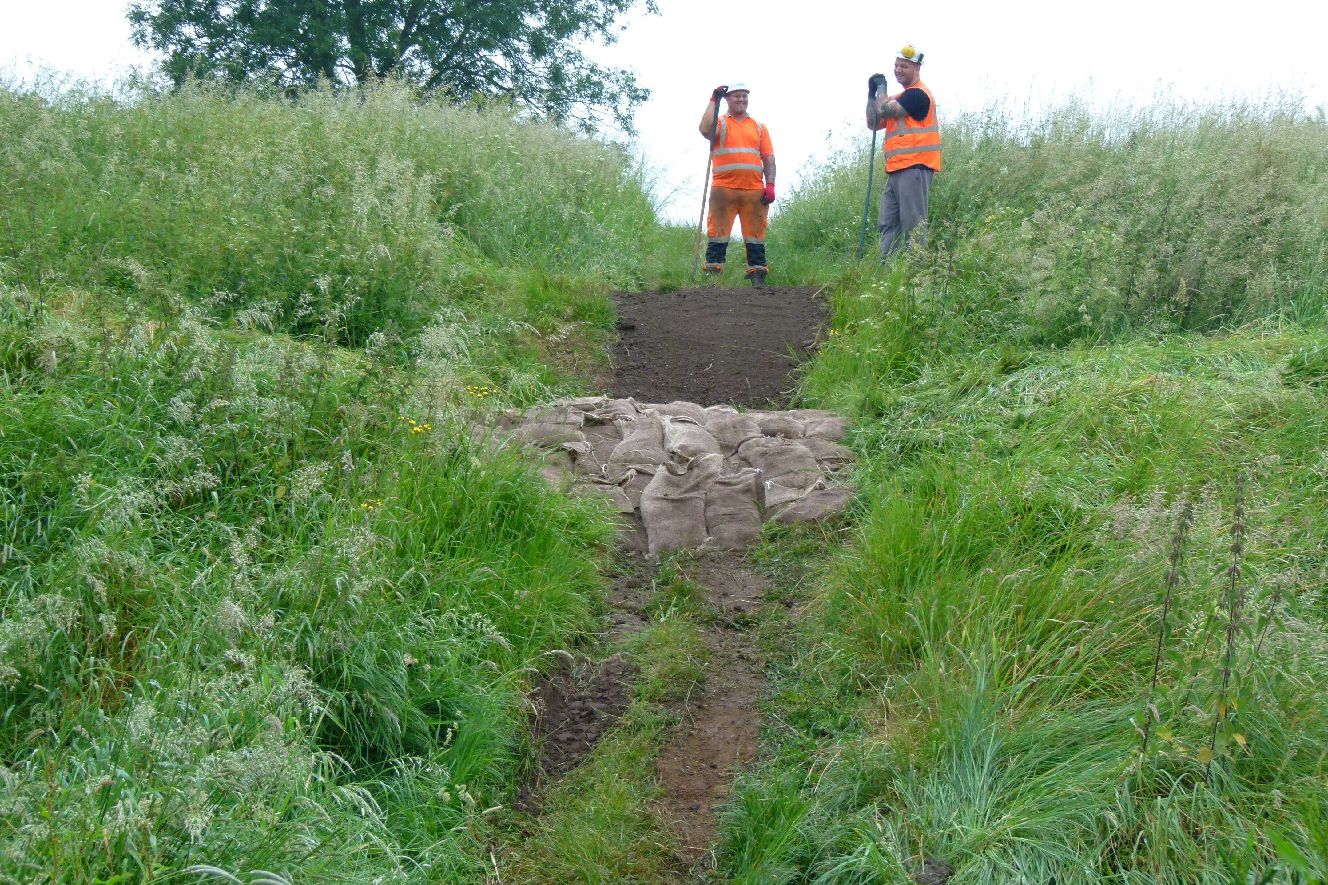 The programme of repair work has been approved by Historic England, which has jurisdiction for Scheduled Monuments. Hessian bags containing archaeologically sterile soil are first pinned into the rut damage. Then the ground is reprofiled to its original height with archaeologically sterile topsoil and planted with a wildflower seed mix.