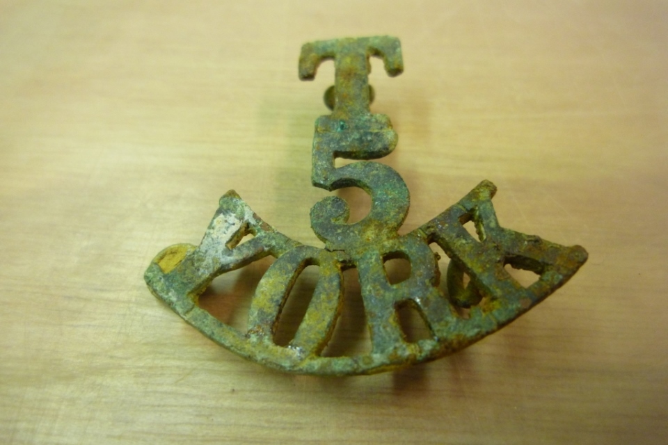 The recovered cap badge belonging to Private Parker, Crown Copyright, All rights reserved
