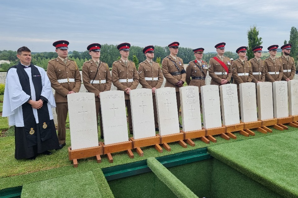 MemberS of the Royal Anglian Regiment with the 12 headstones of the unknown soldiers being buried at Wancourt British Cemetery (Crown Copyright)