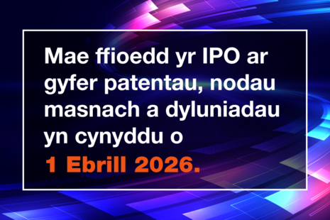 Mae’r Swyddfa Eiddo Deallusol (IPO) yn cynyddu ffioedd ar gyfer patentau, nodau masnach a dyluniadau o 1 Ebrill 2026, yn amodol ar gymeradwyaeth seneddol.