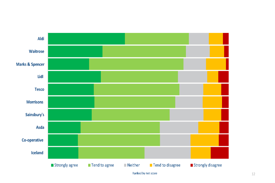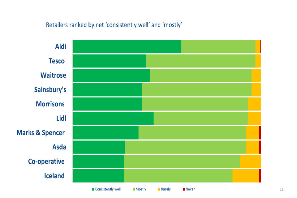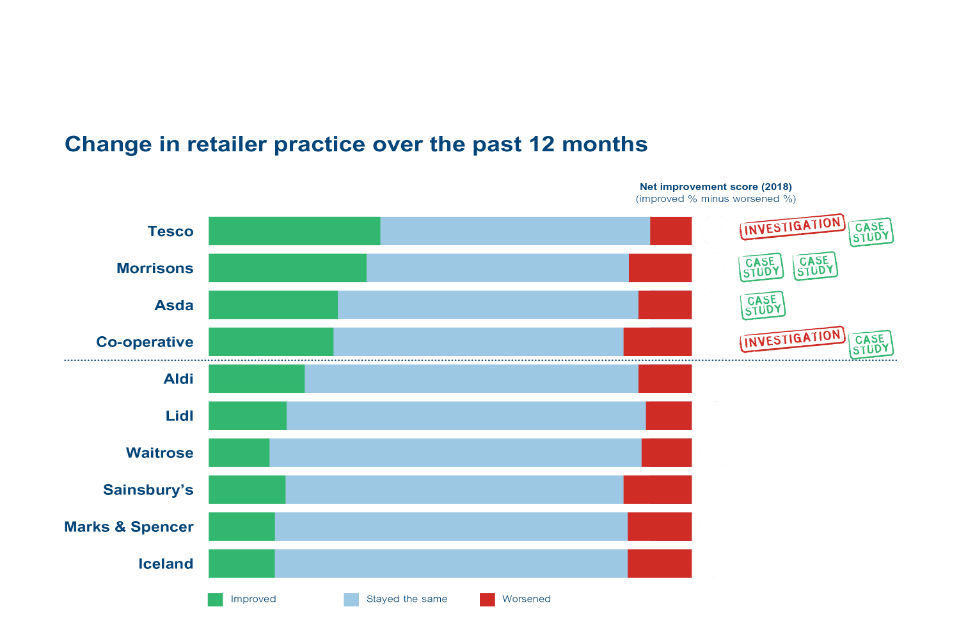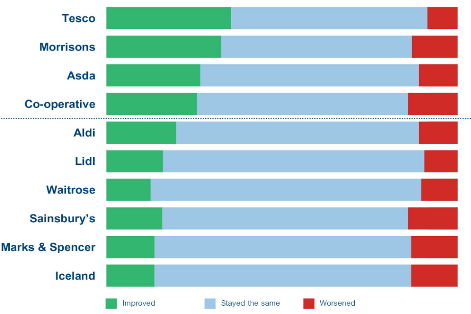 Change in retailer practice over the past 12 months. Tesco, Morrisons, Asda and Co-op take the top 4 slots.
