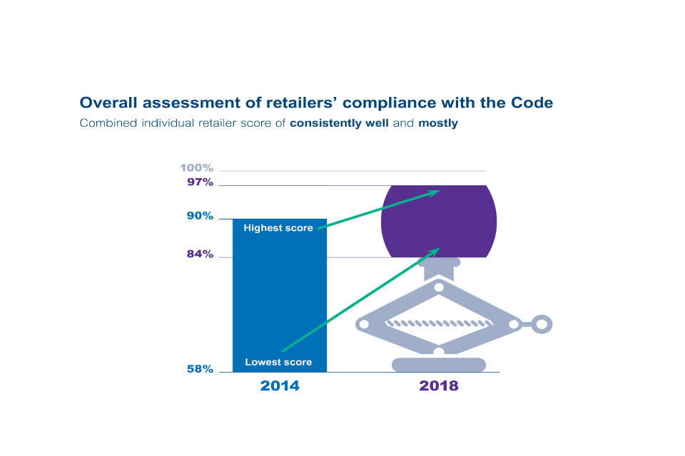 In 2014 the overall assessment of retailer's compliance with the Code was spread between 58% and 90%. In 2018 this had changed to between 84% and 97%.