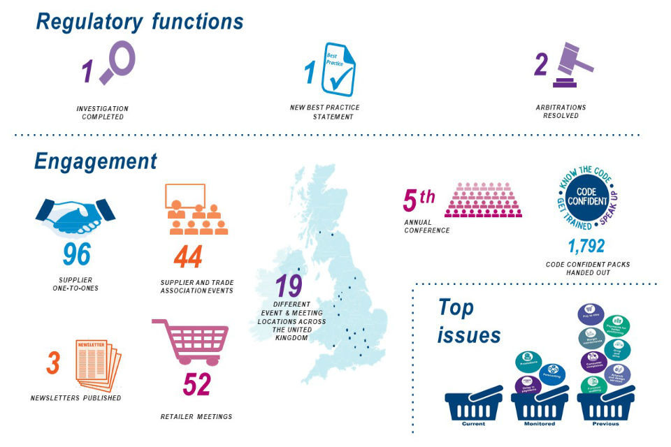 Regulatory functions: 1 investigation completed, 1 new best practice statement and 2 arbitrations resolved. Engagement: 96 supplier meetings, 44 supplier and trade association meetings, 53 retailer meetings in 19 locations.