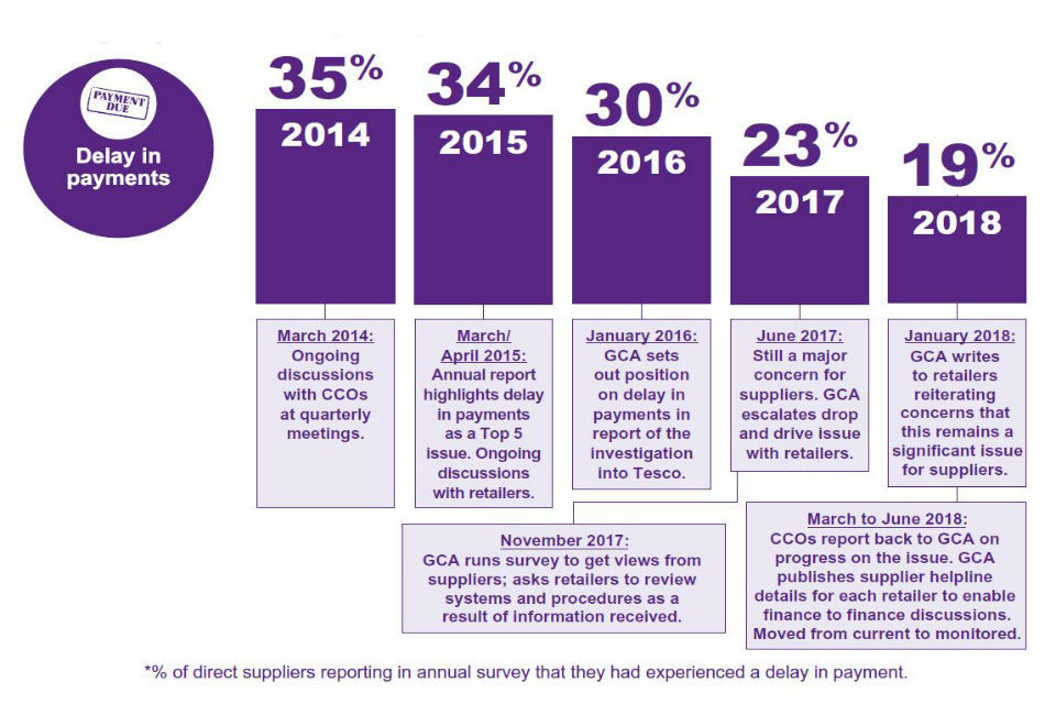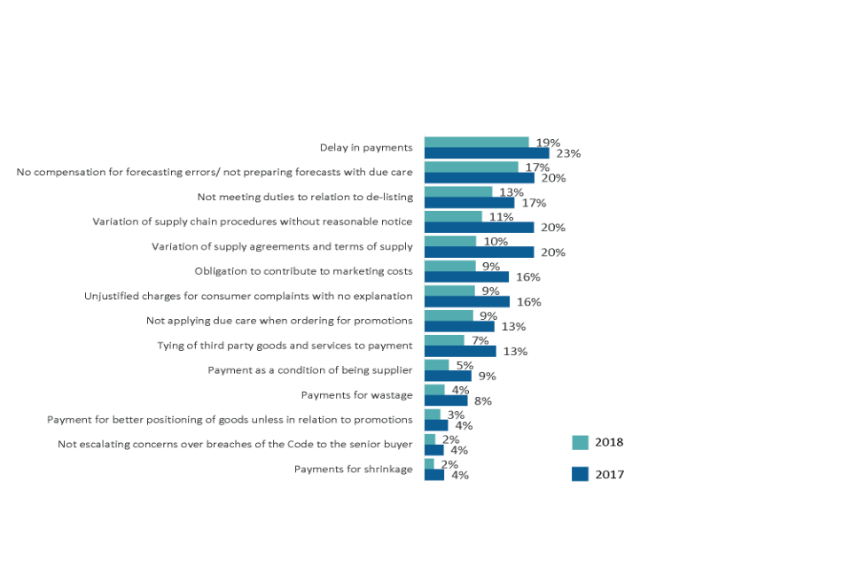 The fifth annual survey was open during March and April 2018. This was promoted through advertising in The Grocer and work done by retailers and trade associations to encourage their suppliers and members to complete it. The GCA also raised awareness directly at trade shows, including hosting a stand at Food and Drink Expo where suppliers could complete the survey. There was a strong response rate which gave the GCA important information about what retailer practices were still of concern to suppliers. The top three issues suppliers said they had experienced over the past 12 months remained the same: delay in payments; no compensation for forecasting errors or not preparing forecasts with due care; and not meeting duties in relation to De-listing. However, the percentages of suppliers that had experienced these issues had fallen from the previous year.