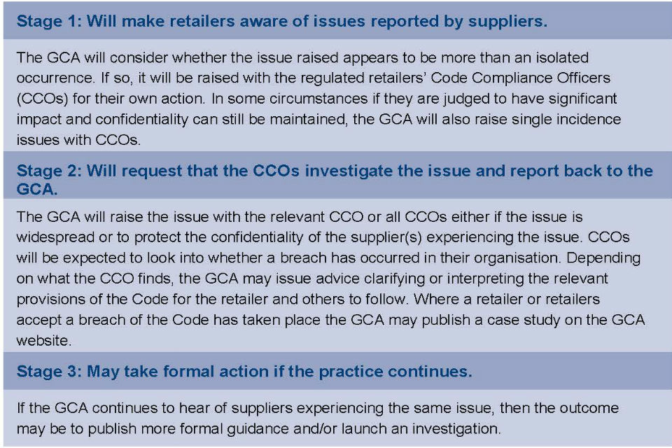 Stage 1: Will make retailers aware of issues reported by suppliers. Stage 2: Request the CCOs investigate the issue and report back to the GCA. Stage 3: May take formal action if the practice continues.