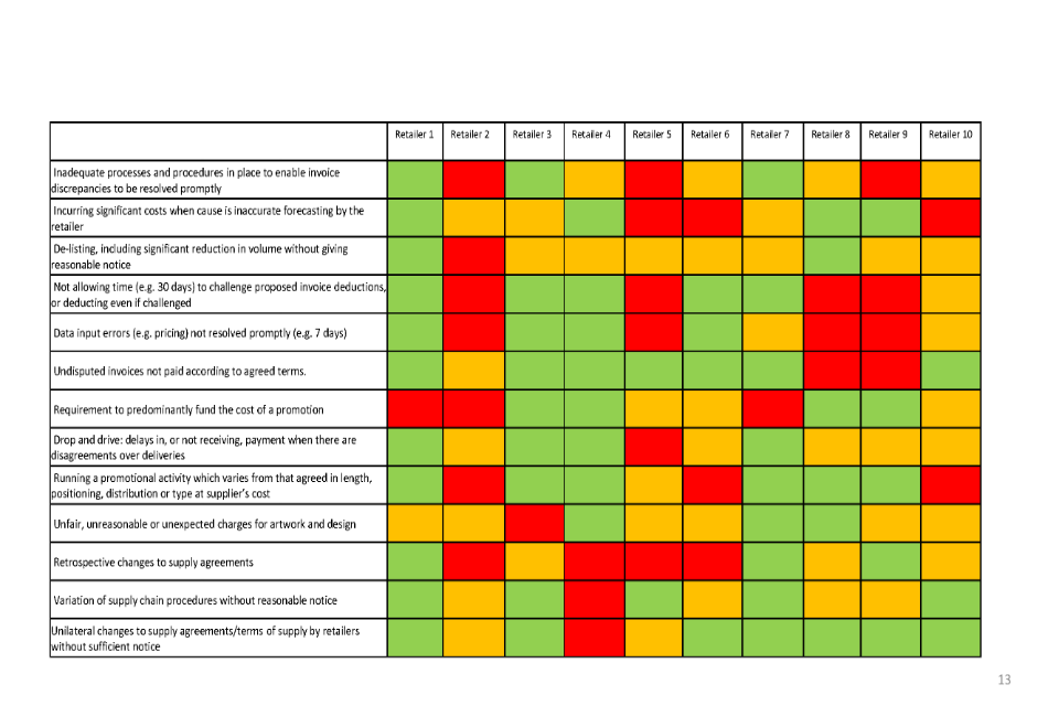 Accordingly, I announced at my conference in June that I no longer had any Top Issue to work on with the retailers and that I would continue to monitor performance of all retailers in relation to delay in payments, forecasting and promotions. The original ten designated retailers have been collating data about these issues and gave me the results in March.