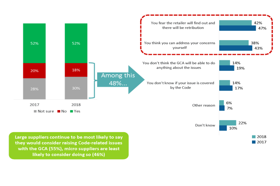 The GCA encourages suppliers to continue to bring Code issues and evidence to its attention in order to inform decisions and actions. The GCA also gathers information from retailers, trade associations and others. The stronger the evidence base, the greater the justification for action.