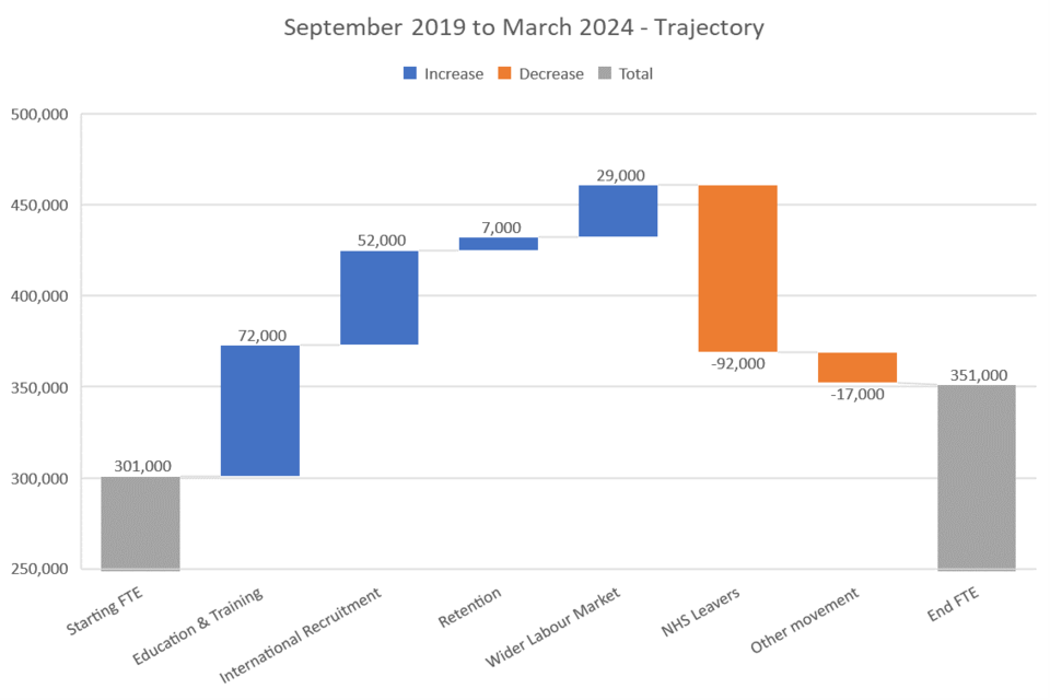 Information on progress on the target is available via public data releases. The most recent data is published by NHS Digital.[footnote 2] To achieve the target, the NHS will need to recruit more than 50,000 FTE nurses. This is because between September 2019 and March 2024, we expect significant numbers of nurses to leave the workforce, either temporarily (for example, for maternity, for career breaks or because they are transferring to providers not covered by the target), or permanently (for example, retirement). The numbers required are set out in more detail below.