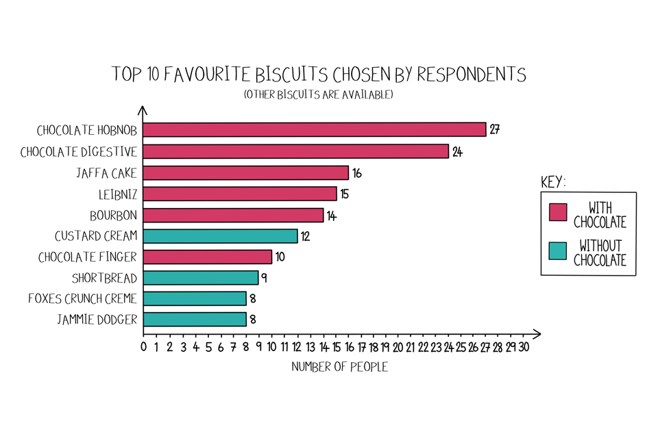 Let’s look at the top bar coloured in pink. We see it is lined up on the y-axis with Chocolate Hobnob. If we trace where the bar ends along the x-axis, we see it matches the label of 27 people. Therefore, we can deduce that 27 people chose a Chocolate Hobnob as their favourite biscuit.