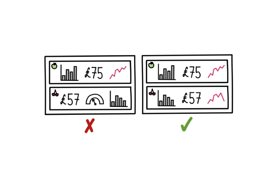 First of all, it’s helpful if the author thinks about the visualisation from the perspective of a problem to solve, or a specific thing to achieve. This should focus on the end goal – this is what is important to communicate – rather than the specifics of what to include. So instead of “I want a pie chart of this and a bar chart of that”, they ideally say “I want to see a trend in the price of biscuits over time”. In this example, pie charts would be unlikely to be a good option. While this may sound easy, it can sometimes be quite complicated. One benefit though is that a title for the visualisation will naturally fall out of the description of the end goal!
