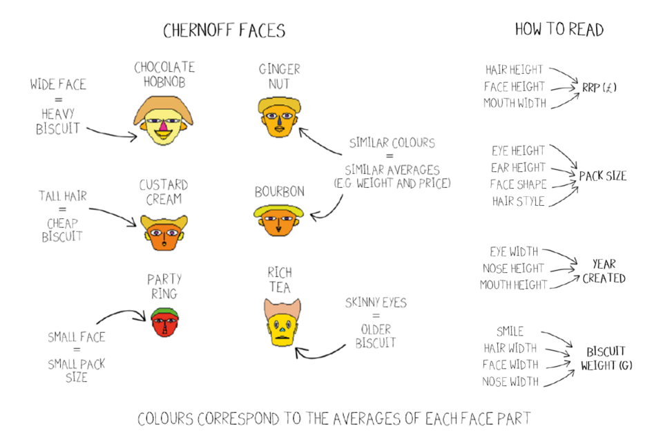 We’ll give one example in a little bit more detail (because we couldn’t resist it): Chernoff Faces (we’ll be honest, Chernoff Faces are so off-piste that you’ll see why we couldn’t resist). In a Chernoff Face, different characteristics are associated with different attributes of the data, and the value of the data alters the characteristic in the face. The example we have given shows a set of Chernoff Faces that explain different attributes about several biscuits. Each face shows you the price, weight, pack size and year of creation of a selection of different types of biscuit. As you can see, there are many elements to each face that explain what they mean, and it can be difficult to work out what is going on! Whilst it might be eye-catching and funny, and help you spot outliers (in this case the Party Ring looks a lot different to the others), and match similar faces (like the Bourbon and Ginger Nuts who have similar cost and weight), it requires a lot of context to explain and lots of thinking is needed.