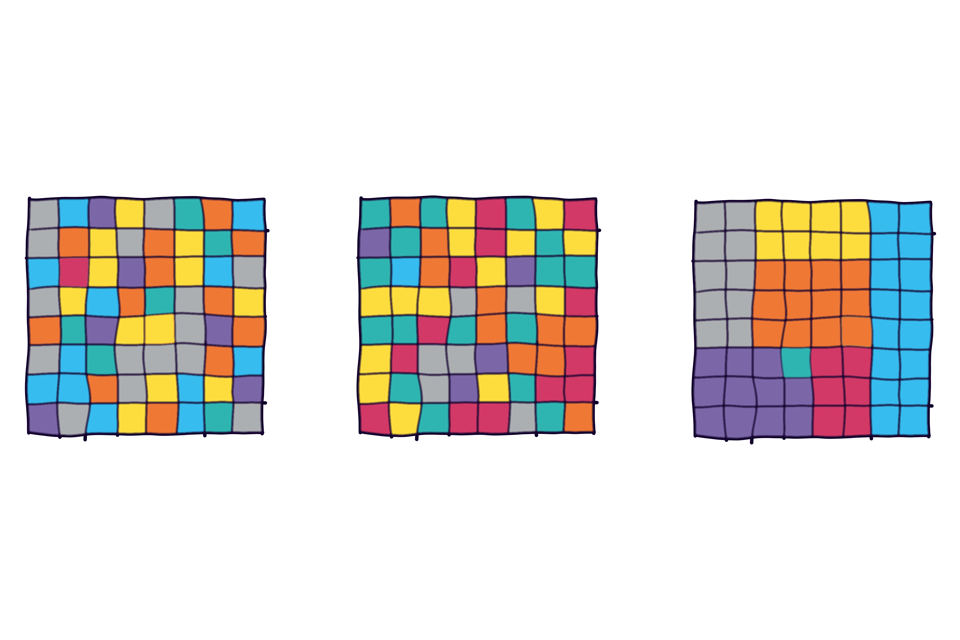 Three grids of mixed colours, each with one ‘unique’ colour that is found only on one square.