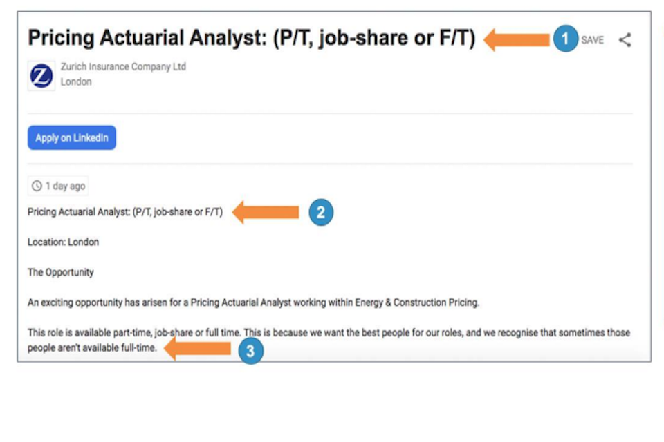 Job adverts at Zurich only mentioned the word “Flexwork” at the bottom of the job advert. In addition, some were advertised as available part-time, but this was extremely rare (less than 1% of positions).