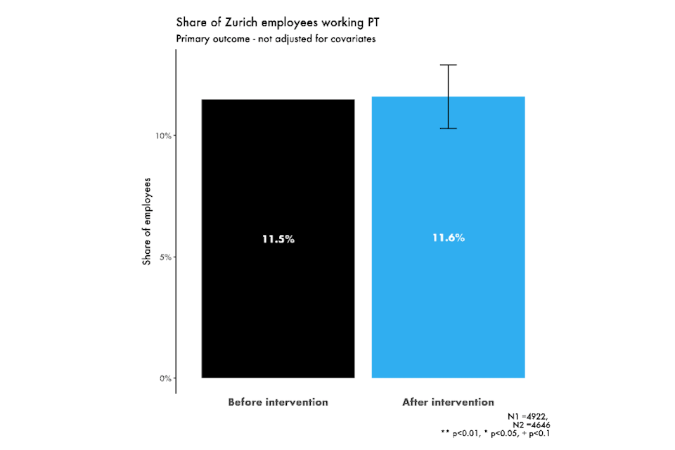 The aim of the intervention was to mitigate part-time work penalties by normalising part-time work at all levels of seniority within Zurich. Results showed that the proportion of part-time workers, which was our primary outcome, remained stable after the intervention. We believe that there could be 3 possible explanations:
