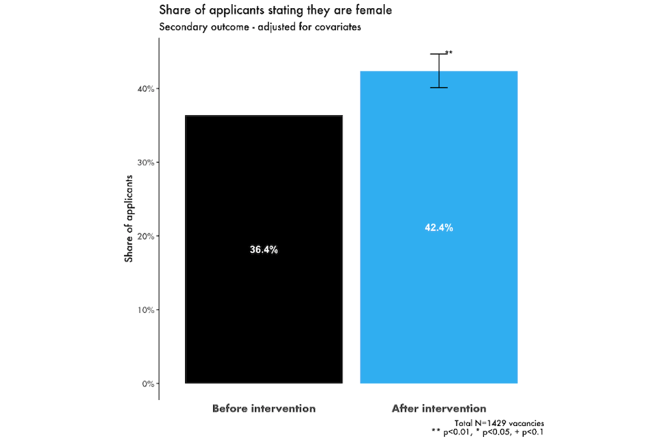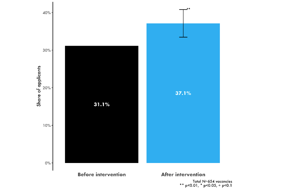 A significant increase of 19.3% in the proportion of female applicants to senior roles (+6 percentage points from the baseline of 31.1% to 37.1%).