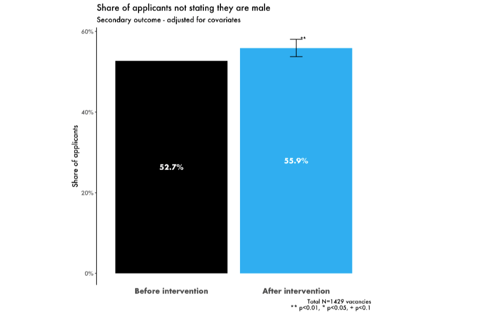 A significant increase of 16.4% in the overall proportion of female applicants (+6 percentage points from the baseline of 36.4% to 42.4%), as well as the proportion of applicants who did not say they were male (+3 percentage points).