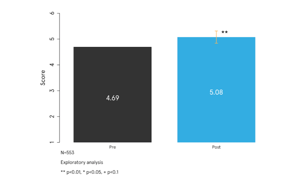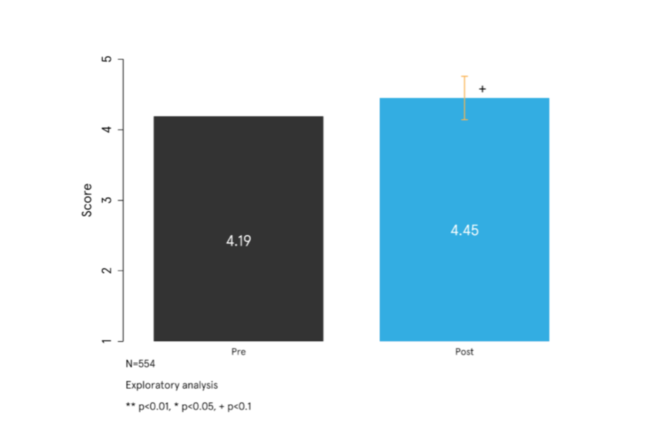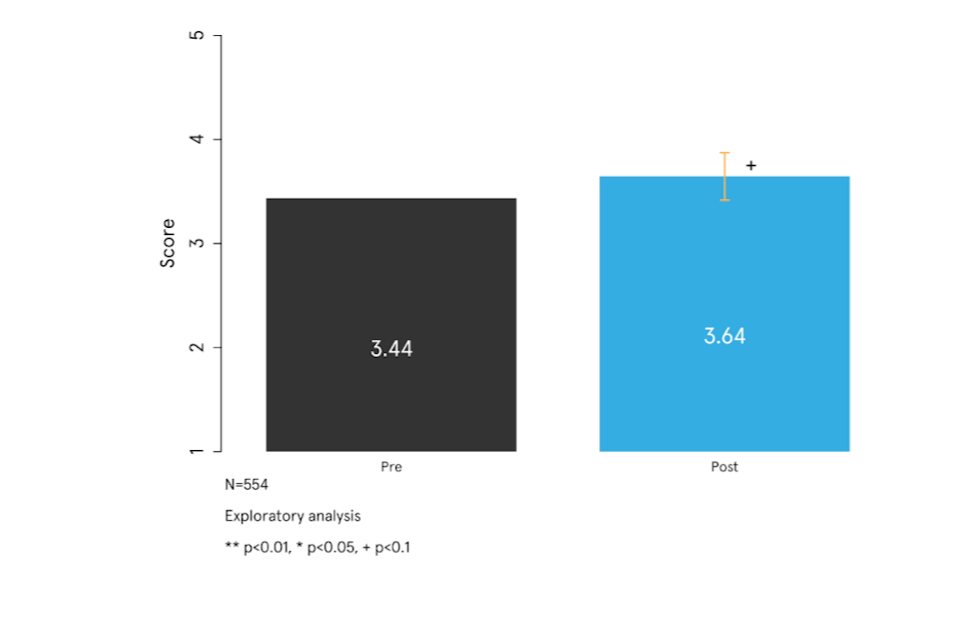 Overall, while the results of this trial are promising, we cannot make causal claims about the impact of our intervention. To generate further evidence, we are currently running a similar intervention as an RCT with a large retail company in the UK. We expect results to be available in mid-2021.
