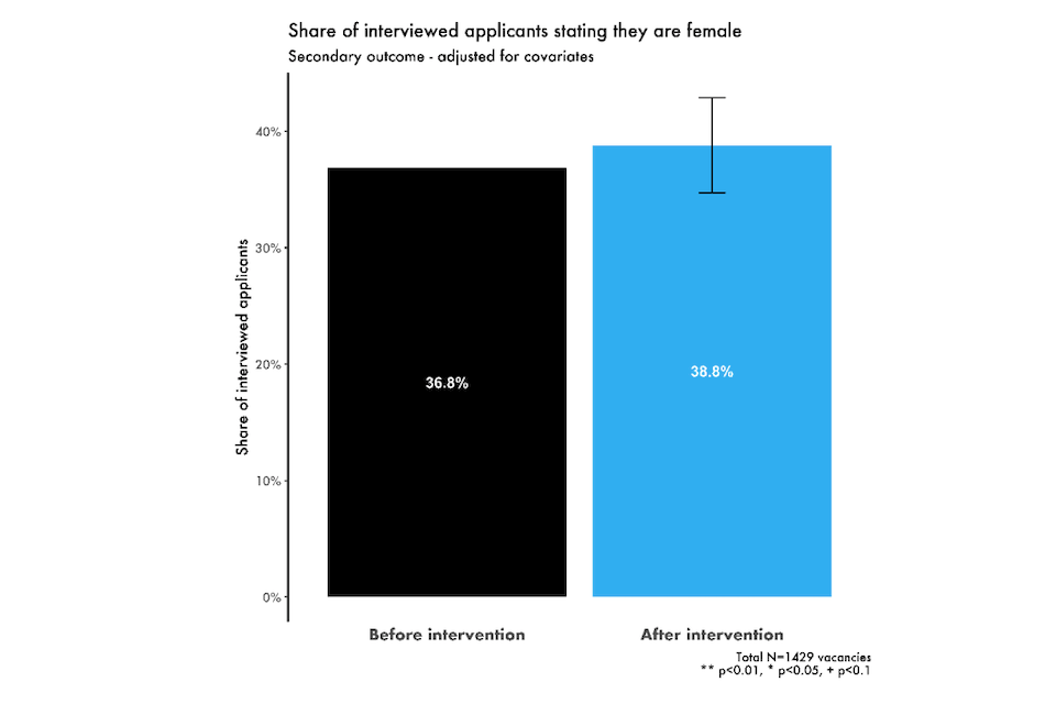 The share of interviewed applicants who stated their gender as female increased by 2 percentage points, but this was not statistically significant. This translates to an additional 125 applicants who stated they are female receiving an interview over and above what previous trends predicted. This was analysed using the same specification used for the secondary analysis of share of applicants (including lags of proportions to account for time trends in labour markets).