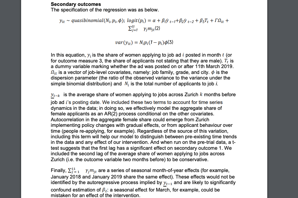 The pre-specified Analysis of the primary outcome encompasses a simple test of the difference in the proportions of Zurich employees working part-time before and after the intervention. For this final analysis, we measured this outcome in February 2019 (before) and February 2020 (after).