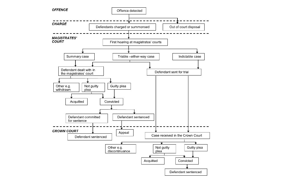 The flow chart in Figure 1 provides an overview of the main court processes for criminal cases. The police will only formally charge or lay information against a defendant if there is sufficient evidence and none of the out of court disposals are appropriate.