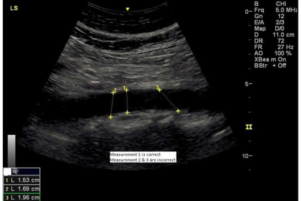 Figure 2. Measurement of the abdominal aorta showing the correct and incorrect lines of measurement