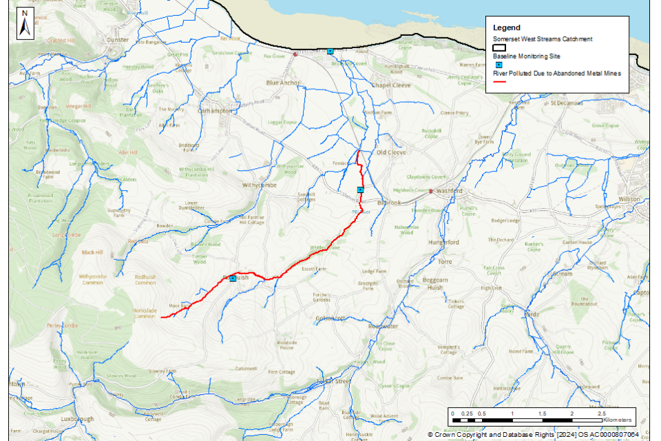 Figure 2. The baseline length of rivers polluted by target substances from abandoned metal mines in the Somerset South and West management catchment is 45km