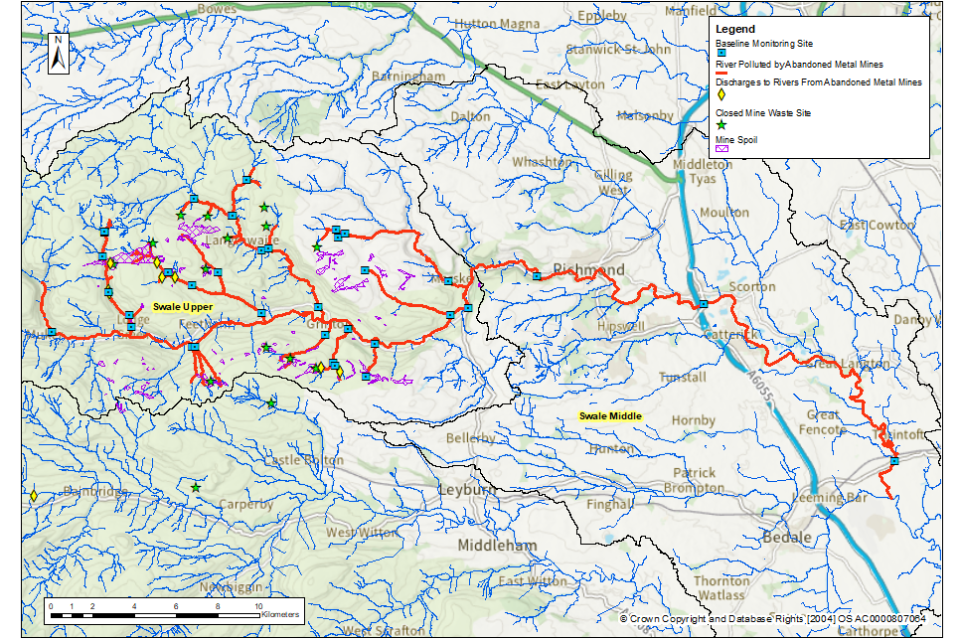 Figure 1 shows the locations of mineral veins, known mine water discharges, closed mine waste facilities known to be causing serious environmental harm, and areas of abandoned mine wastes (mining spoil) in the SUNO management catchment.