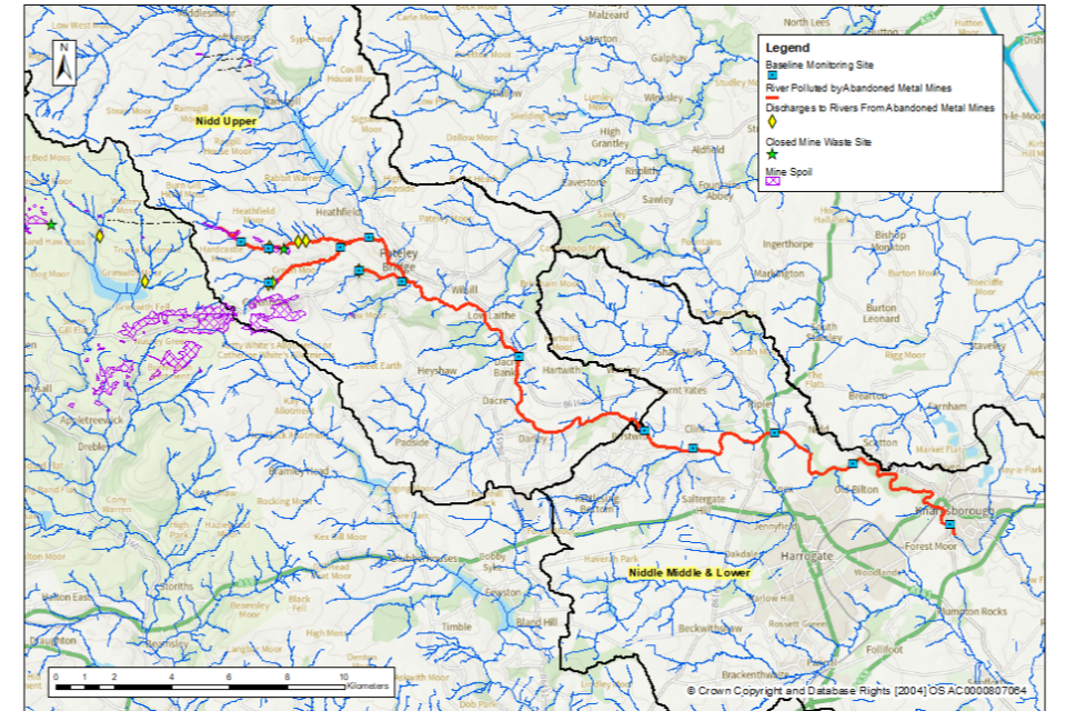 Figure 5. The baseline length of rivers polluted by target substances from abandoned metal mines in the Nidd Upper, Middle and Lower operational catchments is 44km