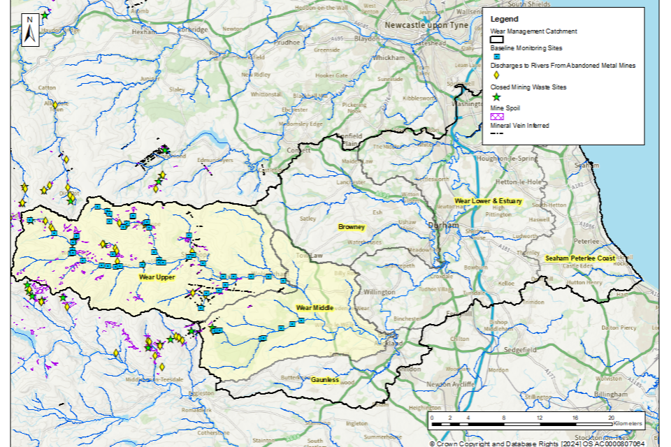 Water quality data collected between 1 January 2022 and 31 March 2024 have been used to determine and validate the baseline length of rivers and estuaries considered polluted in 2022. The length of rivers polluted by abandoned metal mines fluctuates in response to natural variation in rainfall and river flows. However, this length will not materially change unless remediation measures like mine water treatment schemes or diffuse interventions are installed to decrease inputs of metals. Therefore, data collected after 31 December 2022 are considered to be representative of rivers, provided no new remediation measures had been constructed since 2022. Where new remediation measures have been constructed in the Wear management catchment since 2022, the baseline was determined only using water quality data collected before these measures were completed.