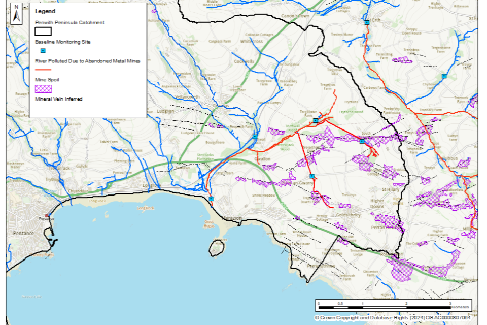 Figure 6. The baseline length of rivers polluted by target substances from abandoned metal mines in the Penwith Peninsula operational catchment is 11km