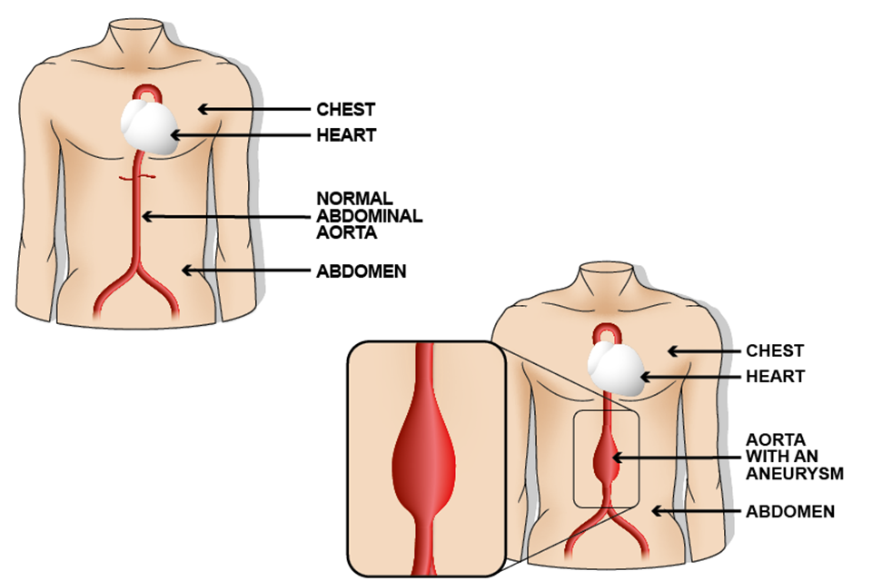 Drawing of a man's torso, showing chest, heart, normal abdominal aorta and abdomen next to another drawing of a man's torso, showing chest, heart, abdominal aorta with an aneurysm and abdomen