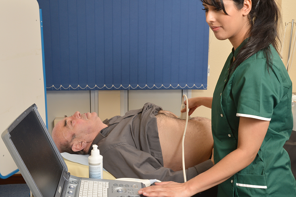 Photo of a screening technician performing an ultrasound scan test on a man who is lying down with his abdomen exposed