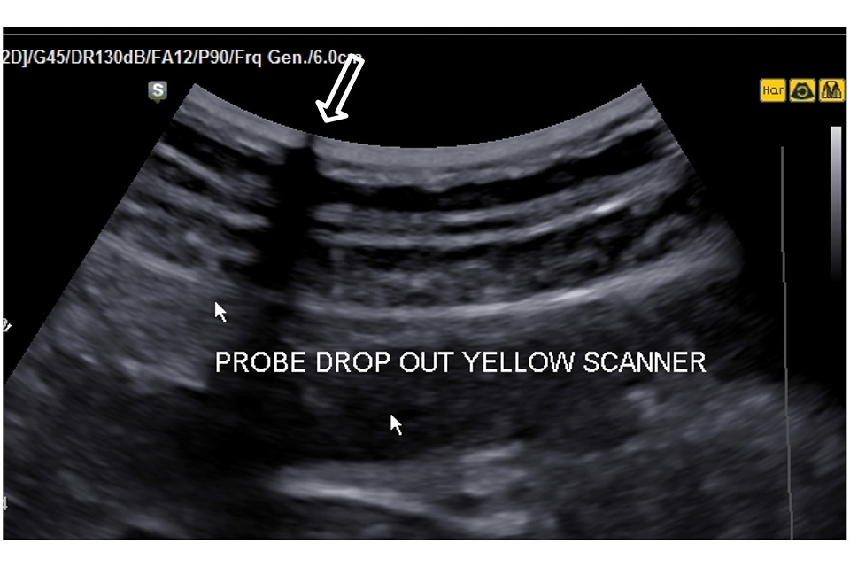 Figure 2. There is a transducer transmission fault at the point shown by the large arrow resulting in a significant loss of image along the transmission line. This probe should be removed from service and repaired or replaced