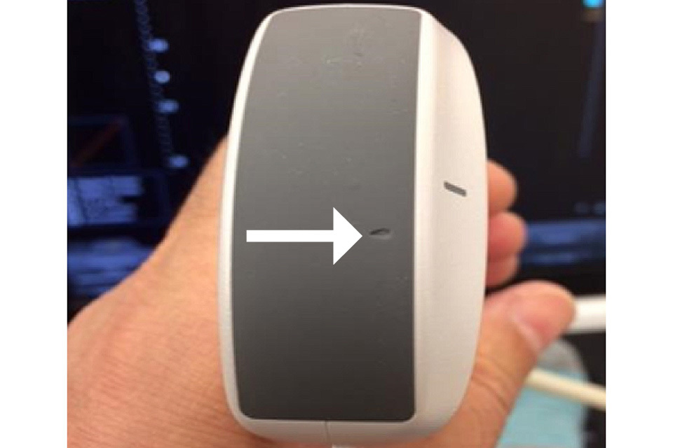 Figure 1. Inspection of the transducer face demonstrates an obvious area of damage shown by the arrow. The probe should be removed from use and assessed by the medical physics department, equipment manufacturer or maintenance provider