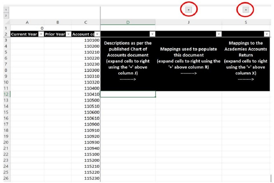 The ‘Mapping’ tab shows the downloaded CoA data from the trust’s FMS data upload. This shows how the account codes map to the draft trust financial statements workbook and the AR.