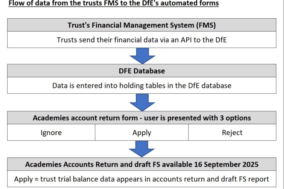 - Trusts send their financial data via an API to the DfE using the trusts FMS.