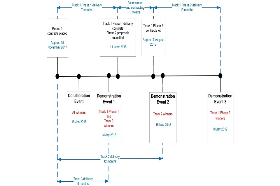 Track 1 phase 1 proposals must focus on a short, sharp, proof-of-concept phase with research lasting up to 6 months in duration for demonstration on 3 May 2018. Final reports and phase 2 proposals must be submitted by the 11 June 2018. Phase 1 proposals should include a descriptive scoping for a longer programme (phase 2 onwards), but the proposal should be clearly partitioned with a costed proof-of-concept stage.
