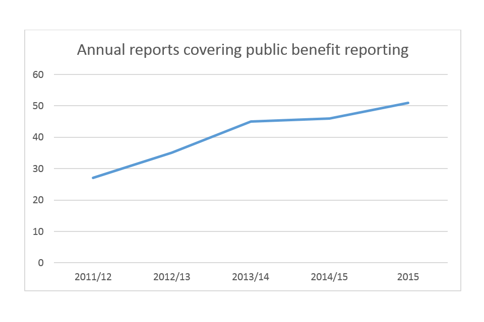 Graph showing percentage of annual reports covering public benefit reporting: around 28% in 2011-12, 35% in 2012-13, 45% in 2013/14, 46% in 2014-15 and 51% in 2015