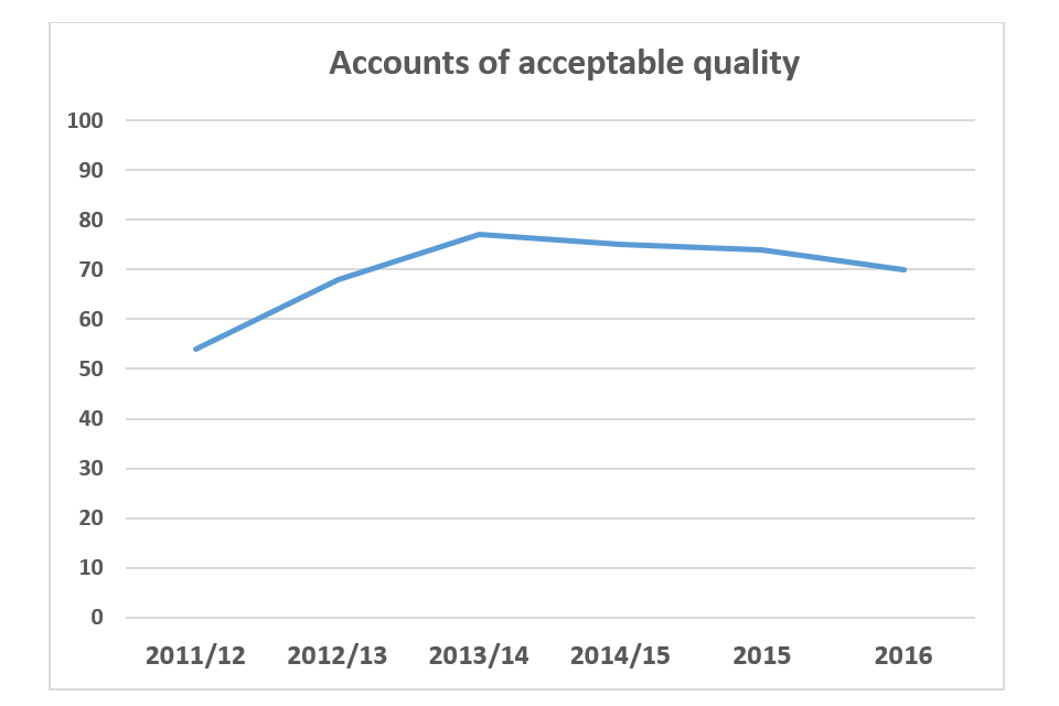 Graph showing the percentage of accounts of acceptable quality: around 54% in 2011-12, 68% in 2012-13, 78% in 2013-14, 75% in 2014-15, 74% in 2015 and 70% in 2016