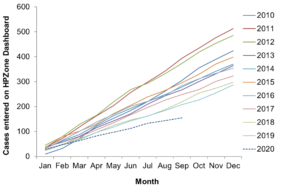 Figure 1. Cumulative cases of acute hepatitis B in England entered on HPZone dashboard 2010 to September 2020. (Please be aware that 2020 data is provisional)